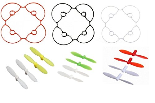 Package includes all the spare parts in picture, three guards(black, red and white), three sets of propellers