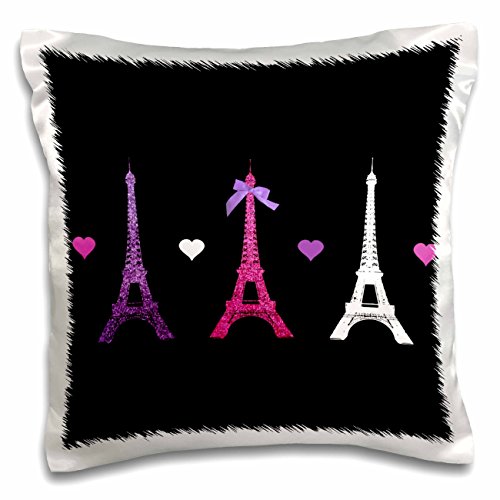 3dRose Girly Eiffel Tower - hot pink purple black Paris towers love hearts stylish French modern France - Pillow Case, 16 by 16-inch (pc_113151_1)