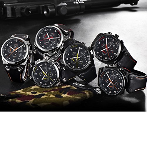 -. Feature : FULL lFUNCTIONAL CHRONOGRAPH: Three Chronograph Sub-dial, 1/10 seconds sub-dial, Seconds Sub-dial and Minute Sub-dial. / QUALITY LEATHER BAND AND COLOR POINTER: Scratch Proof Mineral Glass. Fashion and Cool Design. Genuine Leather Band Bring you Comfortable Wearing Experience. / WATERPROOF FOR DAILY USE: Waterproof (30 M) - 3ATM. Perfect for all kind of business, casual, indoor and outdoor activities and daily use. NOTE: Try not to let the watch in contact with steam and hot water. / High Quality Watches And Exquisite Packaging. It a great gift for yourself , your family or your friends. / Package: Watch * 1; Original Watch Box * 1; Instruction Manual * 1; Warranty card * 1
