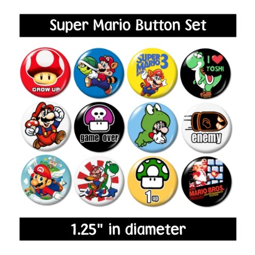 -. Binding : Toy -. Brand : I Love Buttons -. Color : various -. Department : mens -. Feature : You will receive ALL 12 of the Nintendo/Mario buttons pictured / Size: 1.25 inches in diameter / Excellent image quality; professionally printed / Made with all metal parts / PAY SHIPPING ONCE - FREE SHIPPING ON EACH ADDITIONAL ITEM (when purchasing from I Love Buttons) -. Label : I Love Buttons -. Manufacturer : I Love Buttons -. Model : ilb_38 -. ProductGroup : Toy -. ProductTypeName : TOYS_AND_GAMES -. Publisher : I Love Buttons -. Size : 1.25" in diameter -. Studio : I Love Buttons -. Title : SUPER MARIO BUTTONS pins badges nintendo video games yoshi new