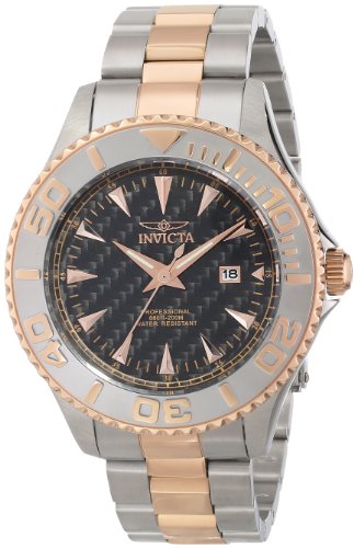 Feature : Japanese quartz movement / Mineral crystal; stainless steel case and bracelet with 18k rose gold ion-plated stainless steel center links / Date window at 3:00 / Black carbon fiber dial with rose gold tone and white hands and rose gold tone hour markers; unidirectional 18k rose gold ion-plated stainless steel bezel with stainless steel top ring; 18k rose gold ion-plated stainless steel screw-down crown / Water resistant to 660 feet (200 M): suitable for recreational scuba diving