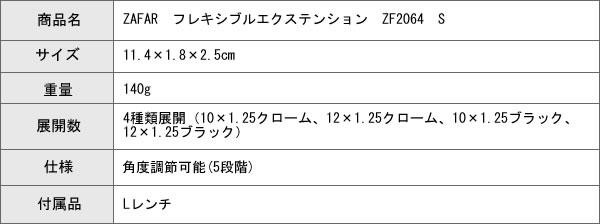 従来品とは異なり、バーの途中で角度を調整できる優れもの。最大60度まで15度ずつ5段階調整できます。 製造国:台湾 素材・材質:スチール 商品サイズ:11.4×1.8×2.5cm 重量:140g 仕様:角度調節可能(5段階) 付属品:Lレンチ ※サプライヤー直送品  ご注文後2~3営業日後の出荷となります【商品名】ZAFAR フレキシブルエクステンション ZF2064 S 10×1.25クローム