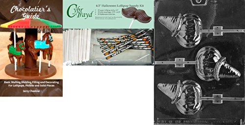 Cybrtrayd "Jack O Lantern with Hat Lolly" Chocolate Mold with Chocolatier's Bundle, Includes 25 Lollipop Sticks and 25 Cello Bags
