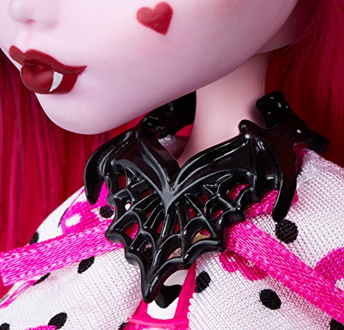 - Switch up Draculaura doll’s silhouette with the white heart-print shawl or the pink webbed overlay for her skirt