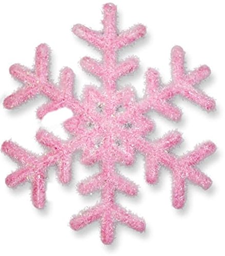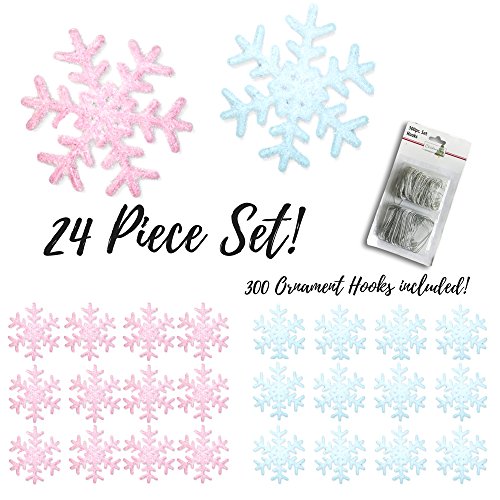 BLUE AND PINK SNOWFLAKES. This set of 24 5 inch snowflakes are the perfect size to add to any Christmas tree. The colors are very bright and colorful. Each colored snowflake has a fuzzy texture to them which makes them very unique.