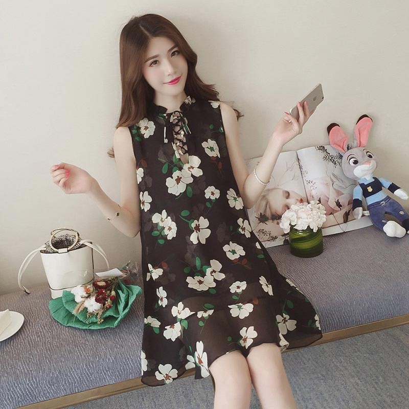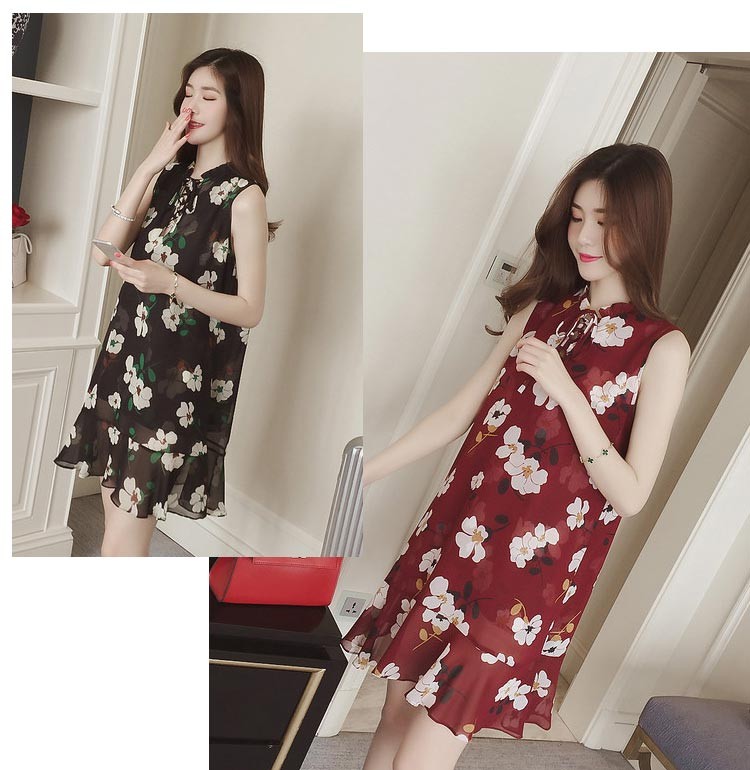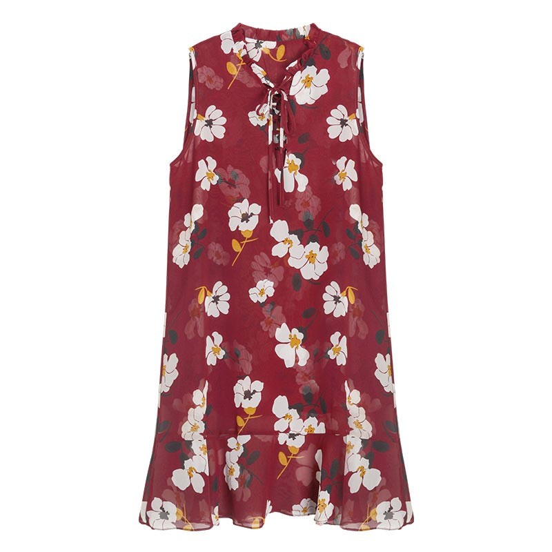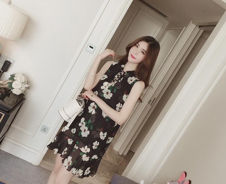 大きなフラワープリント・ネックリボン・ショート丈のノースリーブワンピース♪