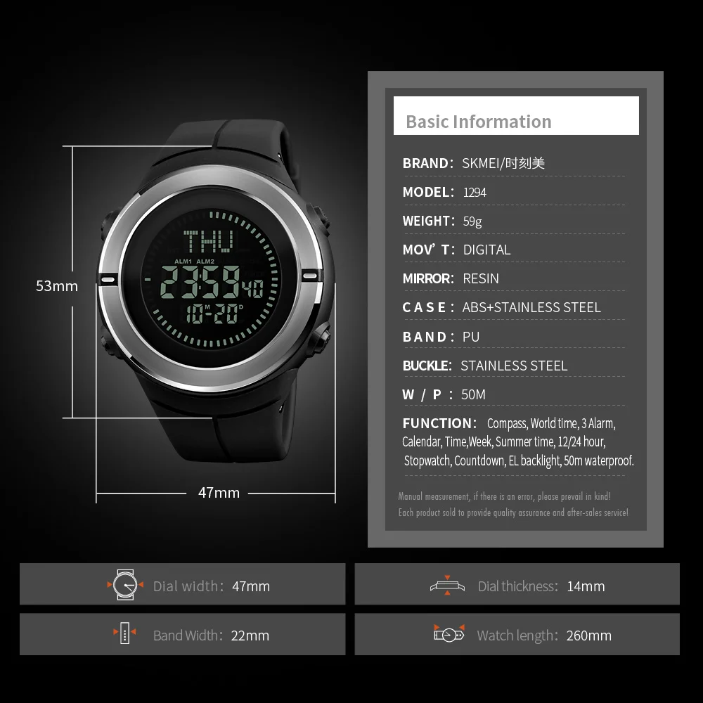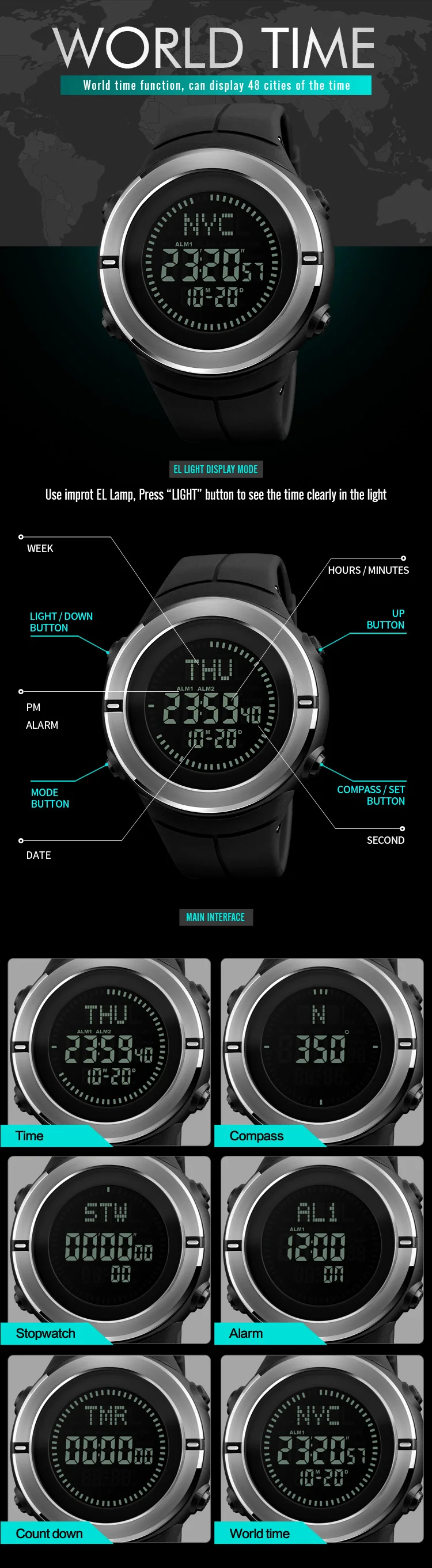 Feature:Back Light,Alarm,Water Resistant,Multiple Time Zone,Week Display,Chronograph,Compass,Stop Watch,Swim,LED display,Diver
