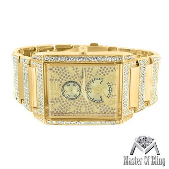 -. Title : Mens Rectangle Dial Watch 14k Gold Plated 2 Time Zone Simulated Lab Diamonds New
