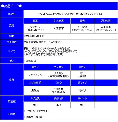 원본상품명: 2018年度モデル フィットちゃん エンブレム ランドセル カ?ボンスタッズモデル ≪?(本?)×ブラック(ステッチ) ≫ 程よい艶モデル A4ポケットファイル ??ワイドサイズ