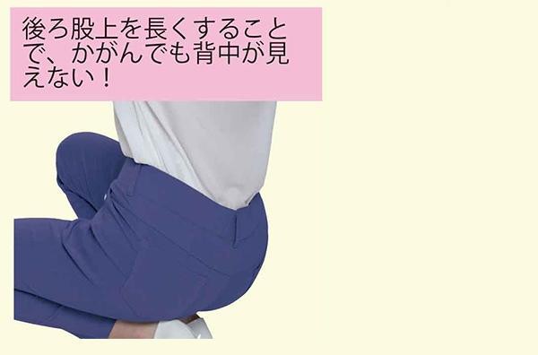 | シンプルなデザインの美脚パンツです。動きやすいストレッチ素材を使用しているので、無理なく履くことができます。ウエストはゴム仕様で着脱楽ちん♪後ろ股上を長くしているので、屈んでも背中が見えることはありません。 |