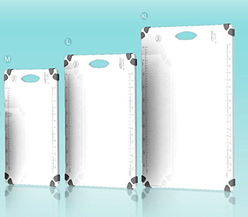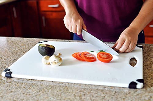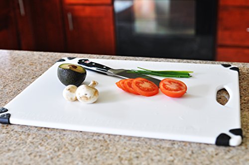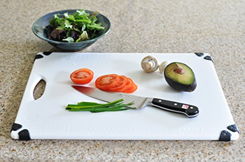 COMMERCIAL GRADE CUTTING BOARD: At 20" x 15" and nearly 1/2" thick, it's constructed of non-porous polyethylene that resists deep cuts but will not dull your knives. It's dishwasher safe, stain resistant and will not warp or degrade over time. It's the perfect gift for a birthday, graduation, house warming party, wedding registry, bridal shower or any holiday or special occasion.