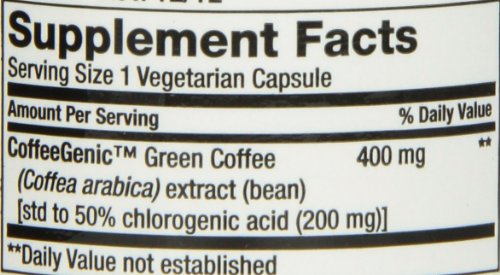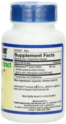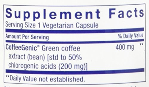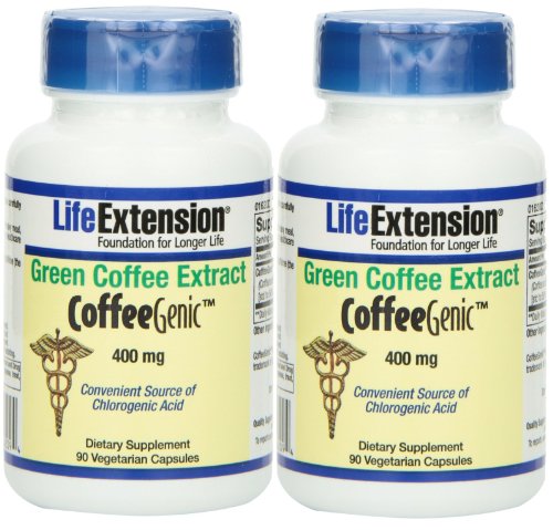 -. Binding : Health and Beauty -. Feature : 2 Bottles of 90 Vegetarian Capsules / Delivers an extraordinarily high proportion of chlorogenic acid for maximum potency / Derived from raw, unroasted coffee beans and naturally low in caffeine / Chlorogenic acid aids in effective glucose absorption and control / Vegetarian capsules (VCAPS) -. Label : Life Extension -. Manufacturer : Life Extension -. ProductGroup : Health and Beauty -. ProductTypeName : HEALTH_PERSONAL_CARE -. Publisher : Life Extension -. Studio : Life Extension -. Title : Coffeegenic Green Coffee Extract 400 Mg - 90 - Vegcap