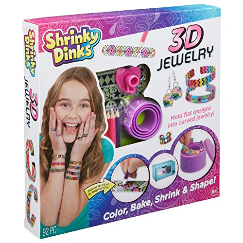 Shrinky Dinks Bake & Shape 3DJewelry lets you take your Shrinky Dink jewelry to a new dimension! Just use the silicon mold to bake thin flexible flat Shrinky Dink shapes into thick sturdy plastic cuffs. Comes with earring and ring mold too! All you have to do is design and color, slide into the mold, then bake in the oven. It's easy and safe. This complete set includes silicon ring mold, silicon bracelet mold, 12 bracelet, 4 earring and 10 ring pre-cut and pre-printed Shrinky Dinks shapes, 4 earring hooks, 4 jump rings, 48 sticky gems, 8 colored pencils and easy instructions. Recommended for children 8 years of age and older.Feature