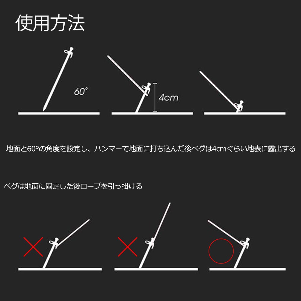 When using a peg, set an angle of 60 ° with the ground, and after driving into the ground with a hammer, the peg is exposed to the ground surface about 4 cm.