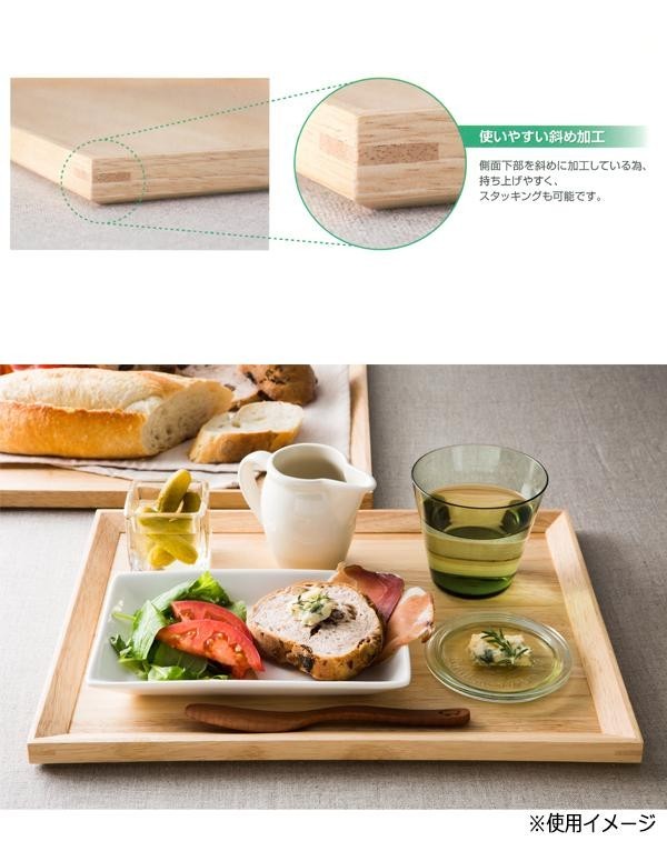 シンプルで飽きのこないデザインのウッドトレーです。手入れがしやすく、斜め加工の側面なので持ち上げやすくて、スタッキングも可能。食器を乗せるのはもちろん、パンなどを置いてもお洒落です♪ |