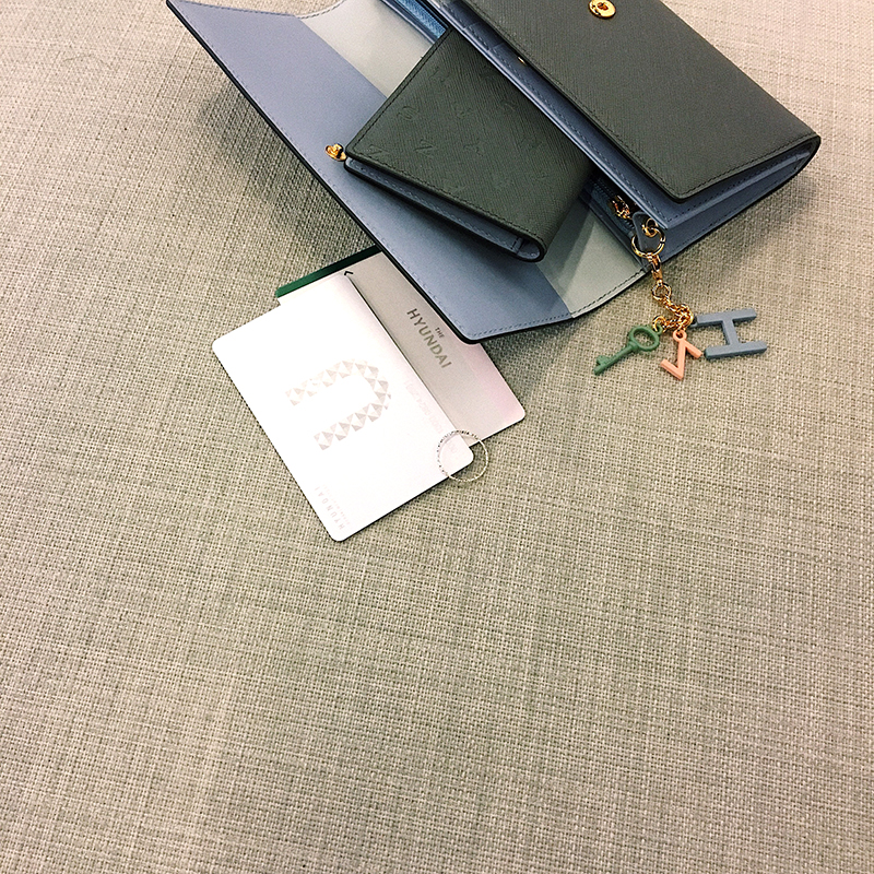 로고 참 장식으로 여성스러운 느낌을 살렸으며 탈착가능한 카드 지갑을 세트로 구성하여 실용적인 아이템입니다.