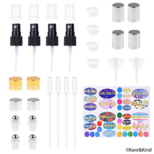 The Kare & Kind Replacement Caps and Sprayers Kit includes: 4x Fine Mist Sprayer, 4x Orifice Reducer Cap, 4x Rolling Ball Cap, 4x Mini Dropper, 2x Funnel, 39x Writable Labels