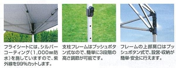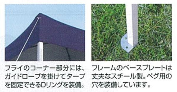 | 素材・材質 | フライ:ポリエステル150D・シルバーコーティング(1000mm防水)UV加工 フレーム:鉄(紛体塗装) |