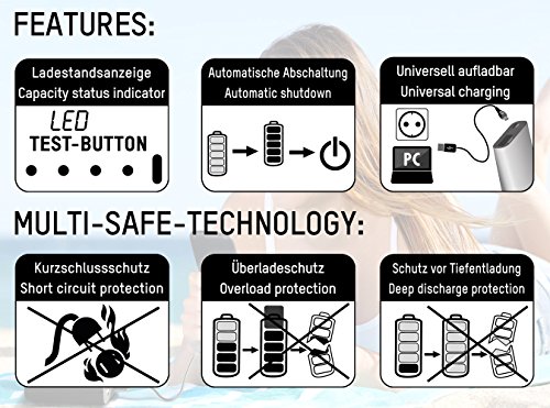 Sicherheit garantiert: Die ANSMANN Multi-Safe Technologie (Uberladeschutz, Tiefentladeschutz, Uberlastschutz und Kurzschlussschutz) garantiert hochste Sicherheit fur Sie und Ihre Gerate