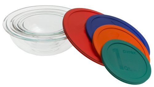 - Feature : 8-piece set of covered mixing bowls with 1-quart, 1-1/2-quart, 2-1/2-quart, and 4-quart capacities / Each cover with a different color and large size marking for easy differentiation / Clear, nonporous Pyrex glass won't stain or absorb odors; allows you to watch your food as it cooks / Incredibly durable as long as sudden changes in temperature are avoided / Safe for oven, microwave, freezer, and dishwasher; 2-year warranty; made in USA