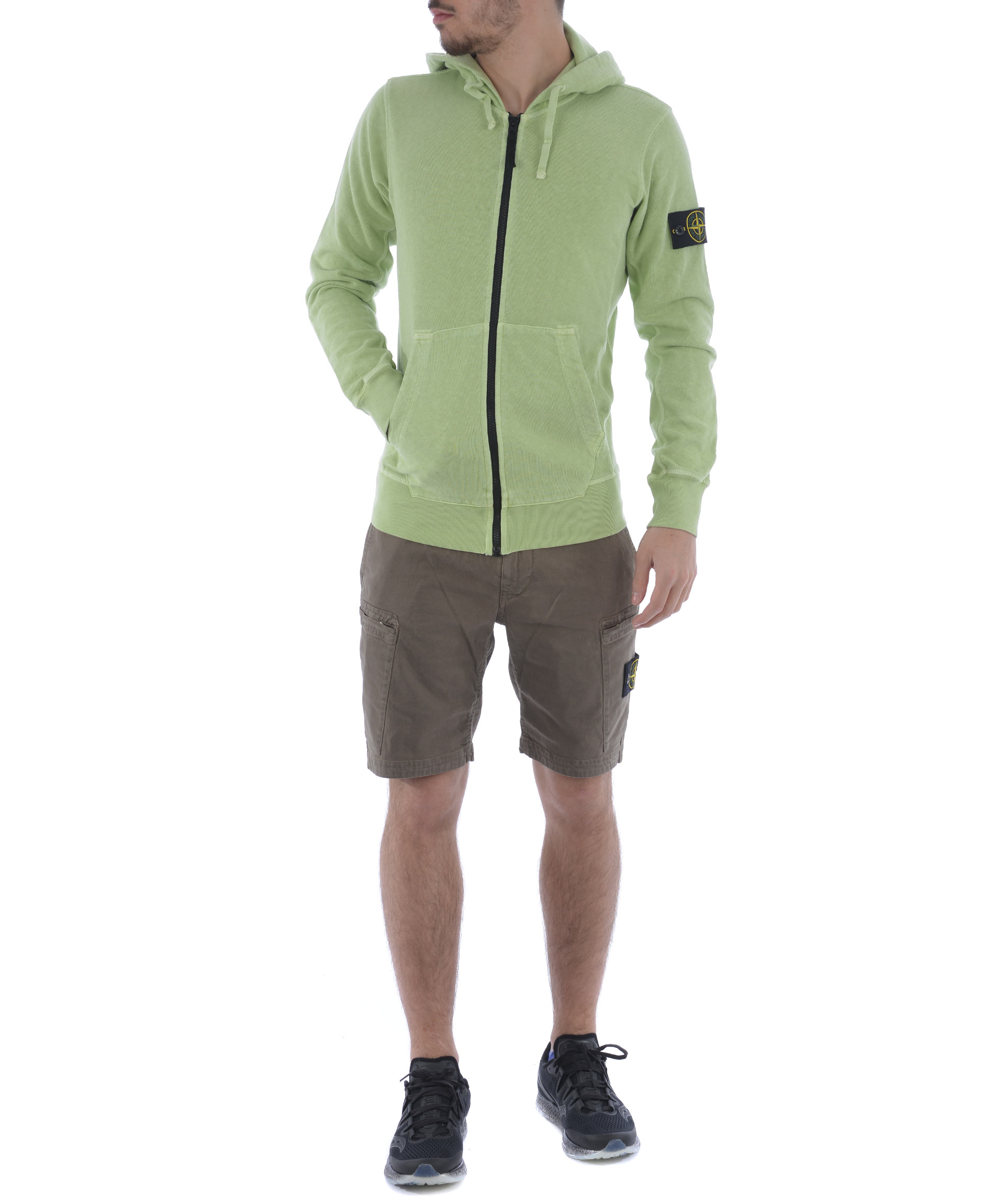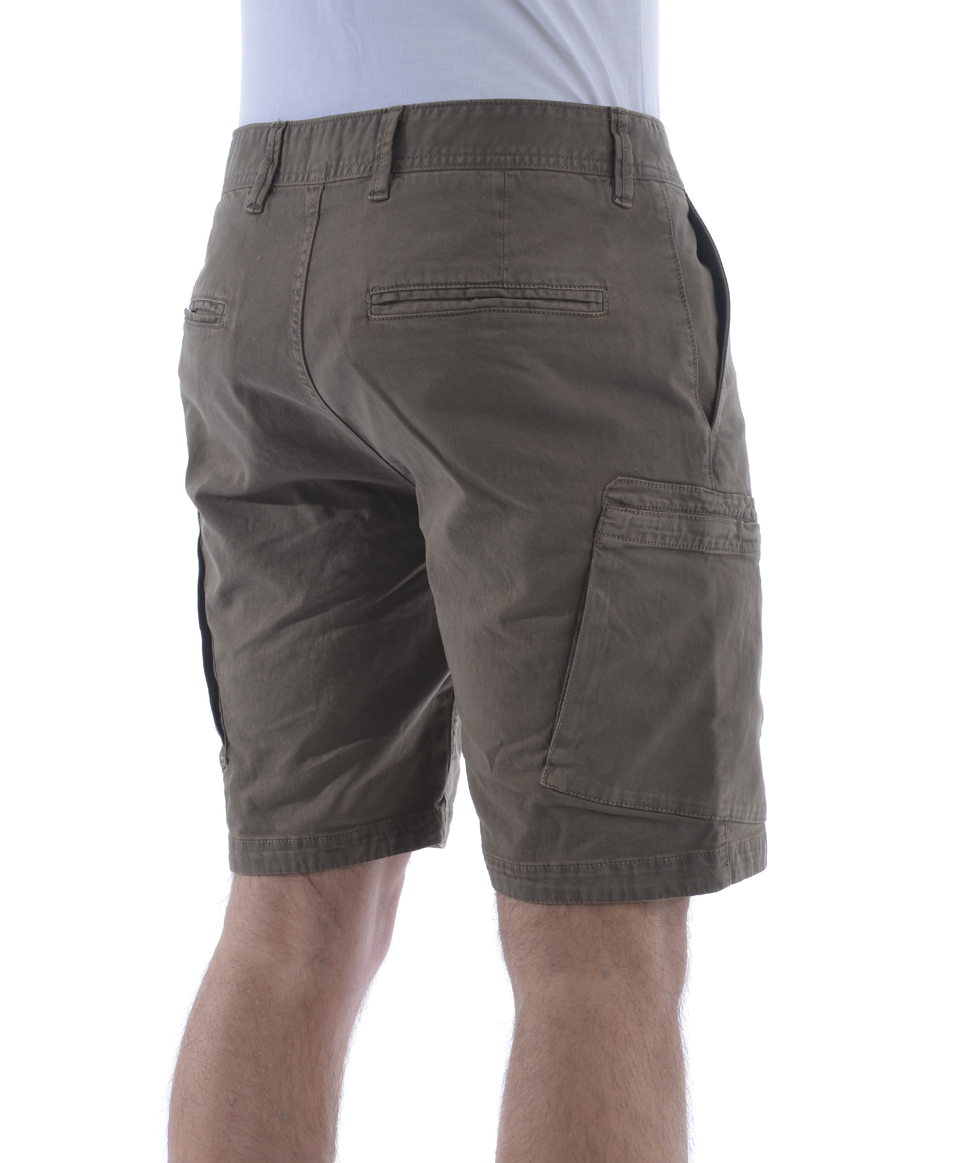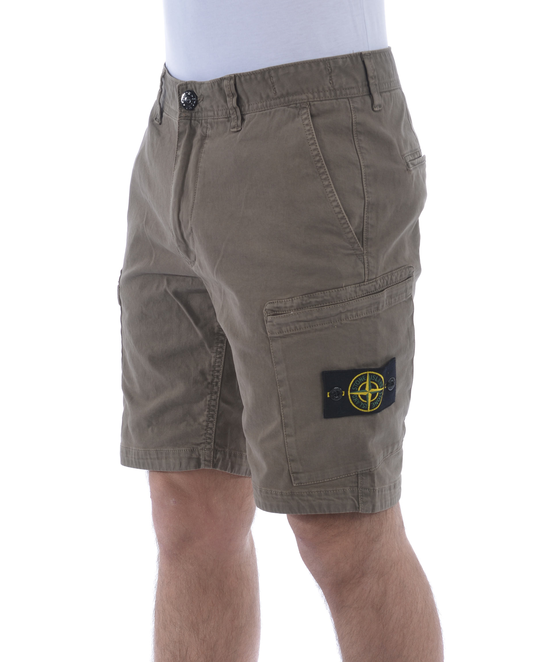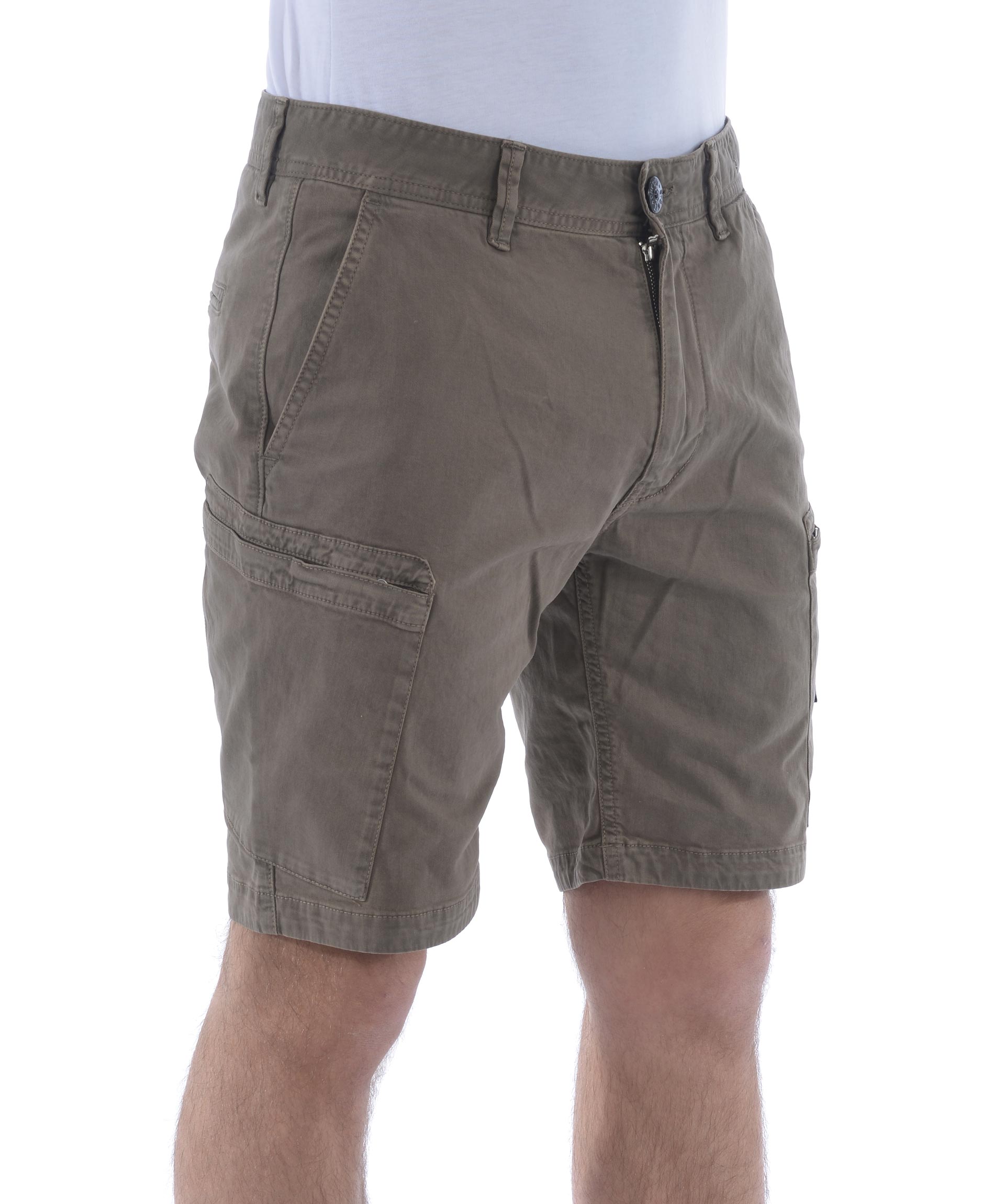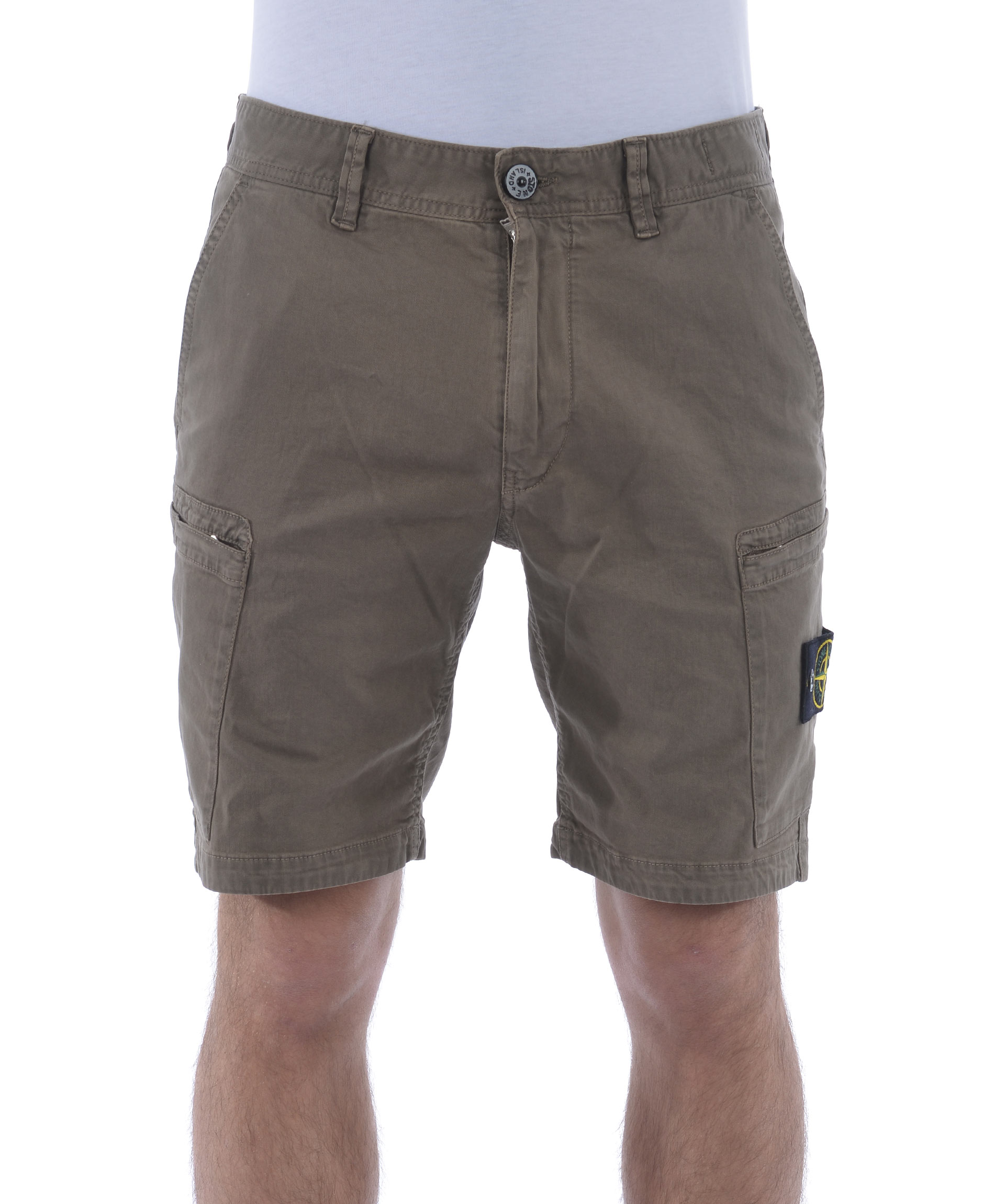 Shorts Stone Island in cotone stretch Tortora effetto old. Tasche diagonali. Tasconi con zip. Tasche posteriori a filo con bottone. Chiusura con zip e bottone. Patch logo removibile sul tascone sinistro. Misura in foto 31 98% cotone, 2% elastene
