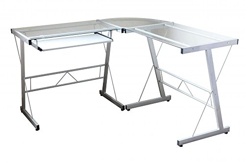 -. Feature : Ideal for business or personal use ; Slide out keyboard tray(can be on different side at your convenience) / Stylish L-Shaped Corner Computer Desk provides ample space for work / Sturdy frame with architectural design supporting all office necessities / Material:5mm tempered glass with plastic cup, steel tube with powder coating / Overall dimensions:51" Lx 51"Wx 30"H