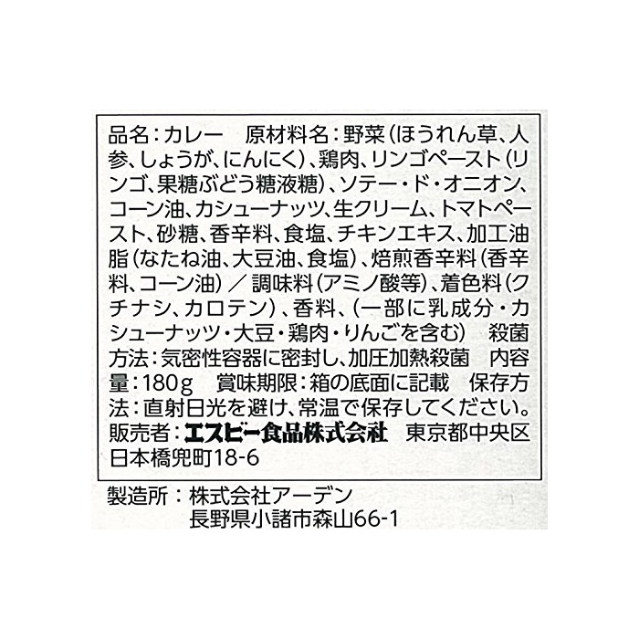 원재료:야채(시금치,(당근)인삼,하 # 것이지만,마늘)고, 닭고기,사과 Paste(사과,과당 포도당액당)고, 소테 드 오니(귀신) 온,콘유,cashew 너트,생크림,토마토 Paste,설탕,향신료,식염,치킨 엑기스,가공 유지(이군요 유,대두유,식염)고, 배전향신료(향신료,콘유)/조미료(아미노산등)고, 착색료(치자나무,카로텐)고, 향료,(일부에 유성분 cashew 너트 대두 닭고기 사과를 포함한다)