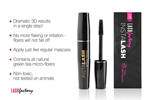 -. Binding : Misc. -. Brand : Lash Factory -. Color : Black -. EAN : 0784672225168 -. Feature : Dramatic 3D results in a single step! / No more flaking or irritation - fibers will not fall off / Apply just like regular mascara / Contains all natural green tea micro-fibers / Non-toxic, not tested on animals -. IsAdultProduct : 0 -. Label : Lash Factory -. Manufacturer : Lash Factory -. Model : LF3D-INST -. MPN : LF3D-INST -. PackageQuantity : 1 -. PartNumber : LF3D-INST -. ProductGroup : Beauty -. ProductTypeName : BEAUTY -. Publisher : Lash Factory -. Studio : Lash Factory -. Title : InstaLash One-Step 3D Mascara by Lash Factory, Instant 3D Lashes in a Single Step -. UPC : 784672225168