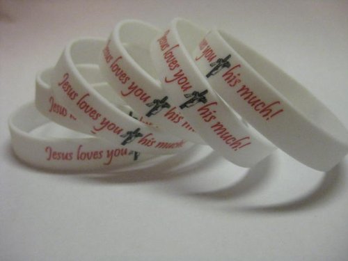 -. Feature : 100 Wristbands Included / Red Lettering on Various White Witness Band / 100 Bands say: 'Jesus loves you this much' / Material: Silicone