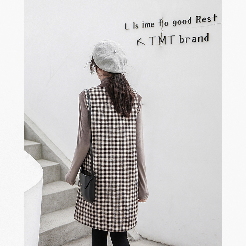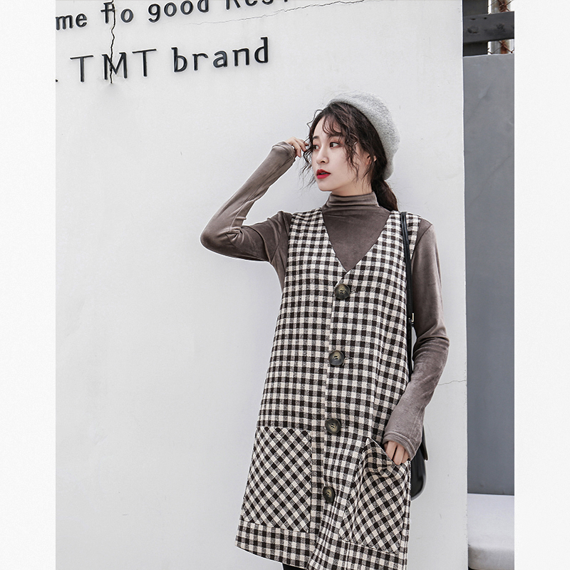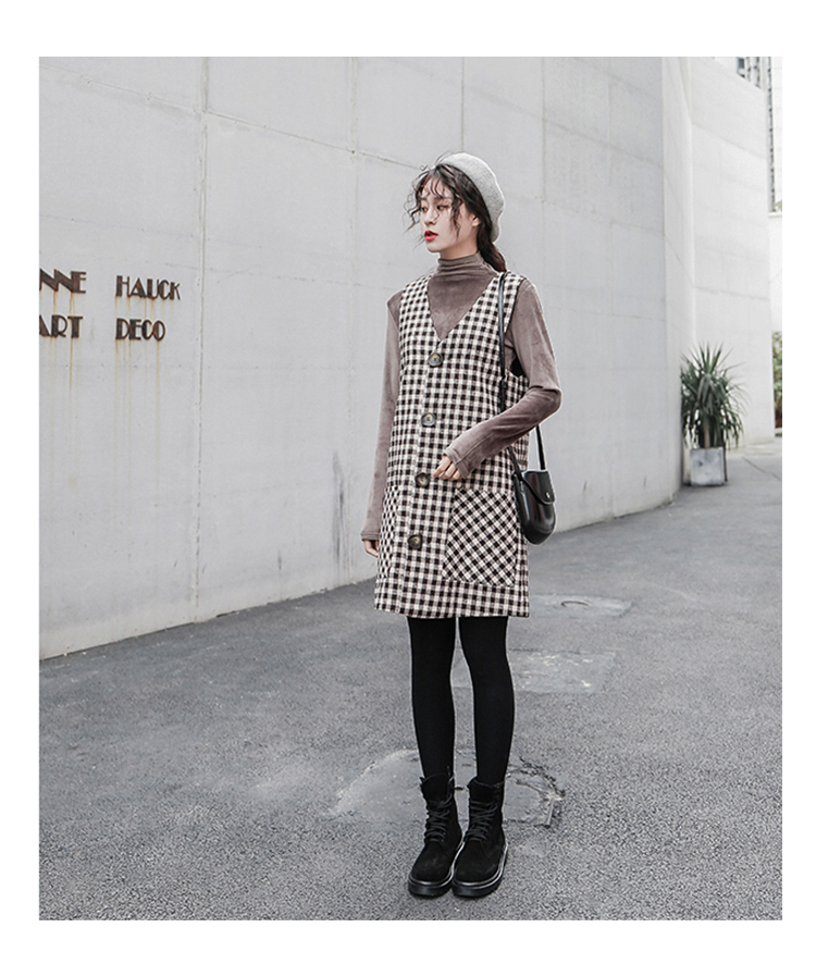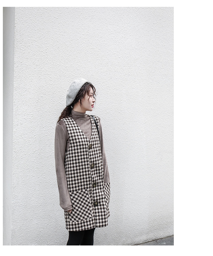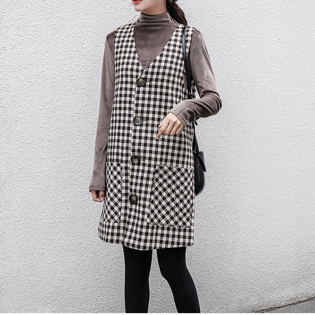 釦が今年らしく、ワンピースとしてだけではなくロングベストとしても着ていただける技ありデザインの一着。
