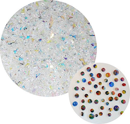 This set includes Rainbow Dichroic Glass Clear Medium Frit, 90COE, 1oz bag and a bonus 1/2oz bag of our exclusive Marbled Glass Frit Balls Mix (sizes range from approx. 2mm to 10mm), 90COE made from Bullseye Glass.