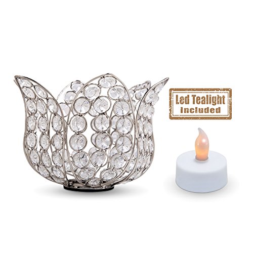 Crystal Look Elegant Tealight Holder - Silver Color Steel Flower Shaped Candle Decor (Flameless Battery Operated Tea Light Included)