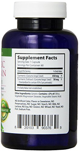 CONTAINS: NO GMOs, NO Gluten, Wheat-free, NO Artificial Color, NO Artificial Flavor or Sweeteners, NO Preservatives, NO Sugar, No Starch, NO Milk, NO Lactose, NO Soy, NO Yeast, NO Fish, and NO Sodium. 100% Cruelty Free. BOTTLE COLOR MAY VARY. Experience what the highest quality Turmeric can do for you. 500mg full-spectrum capsules with 95% extract. Contains 1,000 mg in two caps. Try it 100% RISK FREE TODAY.