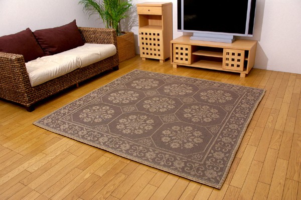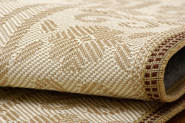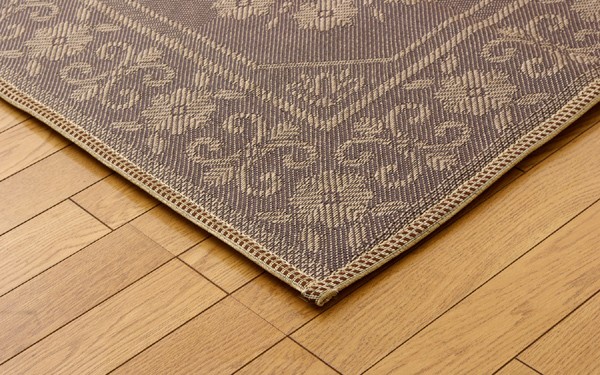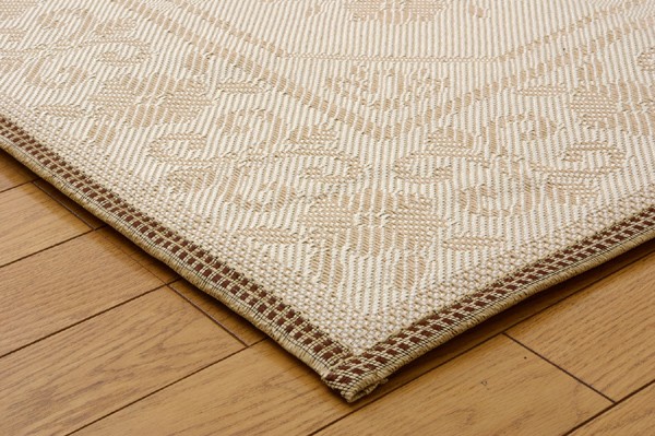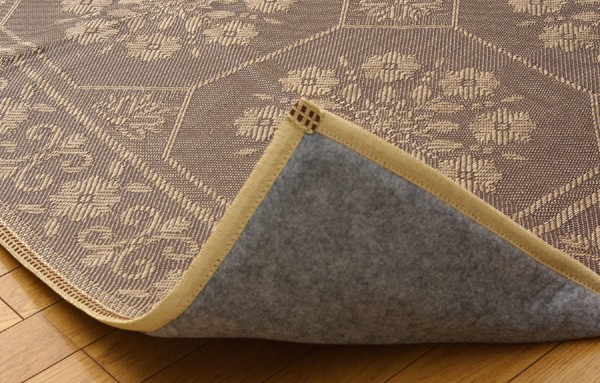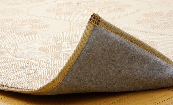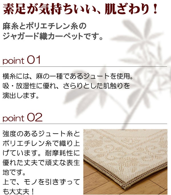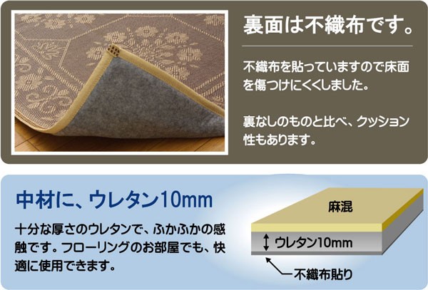麻糸とポリエチレン糸のジャガード織りのカーペットです。横糸には麻糸を使用しています。熱伝導率に優れ、通気性が良く、夏ものの衣料や寝装具などに用いられることの多い素材です。また適度な光沢があり、強度に優れているのが特徴です。中材にはクッション性にこだわりウレタン10mmを使用しました。プニプニとした柔らかい感触をお楽しみ下さい。裏にはフローリングを傷つけにくいよう不織布を貼っています。