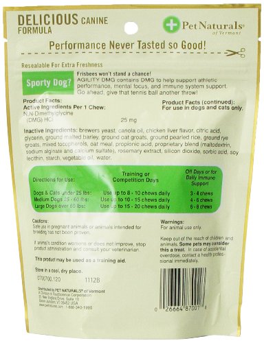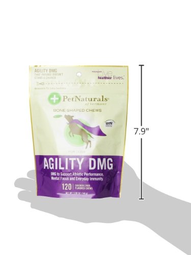 -. Binding : Misc. -. Brand : Pet Naturals -. Department : dog-treats -. EAN : 0026664870018 -. Feature : A chewable dmg formula to support stamina, performance and muscle recovery / Dmg is a glycine derivative that supports immune system health / Increases oxygen utilization and reduces lactic acid buildup, supporting better focus and clarity -. IsAutographed : 0 -. IsMemorabilia : 0 -. Label : Pet Naturals Of Vermont -. LegalDisclaimer : Actual product packaging and materials may contain more and different information than what is shown on our website. We recommend that you do not rely solely on the information presented and that you always read labels, warnings, and directions before using or consuming a product. Please see our full disclaimer below. -. Manufacturer : Pet Naturals Of Vermont -. Model : 0700700.120 -. MPN : 0700700.120 -. NumberOfItems : 1 -. PackageQuantity : 1 -. PartNumber : 0700700.120 -. ProductGroup : Pet Products -. ProductTypeName : PET_SUPPLIES -. Publisher : Pet Naturals Of Vermont -. Size : 120 -. Studio : Pet Naturals Of Vermont -. Title : Pet Naturals of Vermont Agility DMG Bone-Shaped Chews -. UPC : 026664870018