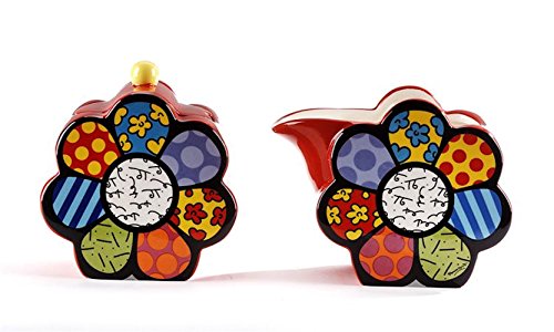 Studio : Giftcraft Publisher : Giftcraft Product Description Romero Britto Ceramic Creamer Sugar 2pc. Set. Features iconic pop artist Romero Britto's popular Flower Icon design with his signature use of vivid color and bold graphics. Creamer holds 11oz, Sugar Pourer holds 12oz. FDA Approved, Food Safe. Handwash only. 0