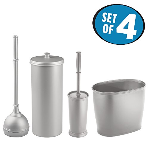 mDesign Bathroom Accessories Set, Plunger with Holder, Toilet Paper Holder, Toilet Bowl Brush, Wastebasket Trash Can - Set of 4, Gray