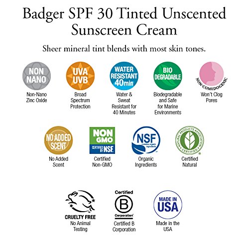 SPF 30 Tinted Sunscreen Cream provides safe, effective, and responsible protection from the sun's damaging rays. Great for the whole family, this moisturizing and water-resistant (to 40 minutes) sunscreen has a sheer tint for face and body (blends with most skin tones) and no added essential oil fragrance, so it's suitable for use on even the most sensitive skin. Blocks both UVA and UVB rays with non-nano uncoated zinc oxide - the safest, most effective single mineral active ingredient. Retains the subtle, natural scent of organic beeswax. Our tubes are made of BPA- and Phthalate-free #2 recyclable plastic. Previously sun-shy Badgers around the world can now be sighted with their noses happily pointed toward warm, luxurious sunshine. See you at the beach!Feature