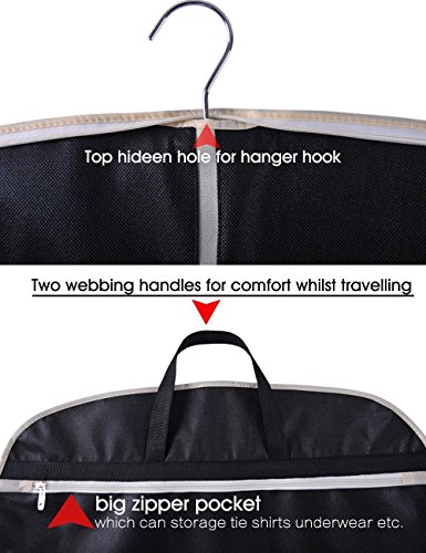 - Can be hang, full length. Two webbing handles for comfort whilst travelling, and top hideen hole for hanger hook.