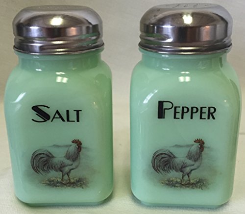 Salt & Pepper Shaker Set w/ Chickens White Leghorn Roosters - Square Stove Top - Rosso Exclusive USA - American Made - Jade Green Glass