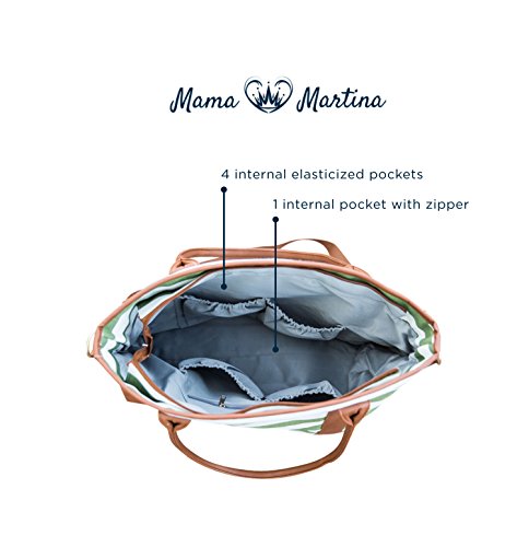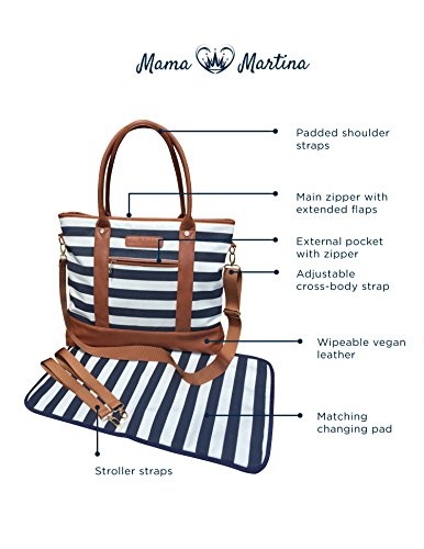 Mama Martina's very own signature diaper bag. Updated edition with improved zipper area. Practical and trendy oversized diaper bag that will keep you organized. We picked materials that are user-friendly and durable. The handles are longer than what you'd normally see in other bags. The tote-style bag is easy to carry around, zipped or unzipped. The padded handles stay put on your shoulder, which is why this bag is so comfortable to use even with a "heavy load". Navy blue and white stripes.Feature