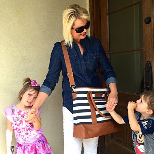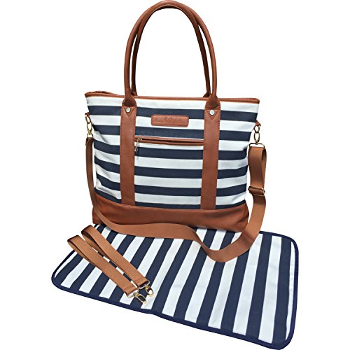 Updated tote-style navy stripe large diaper bag. Excellent choice for moms with multiples. Simple, spacious and easy to carry on your shoulder. Padded shoulder straps won't slide off.