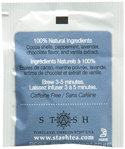 -. Feature : Case of 12 packages each containing 10 tea bags (total of 120 tea bags) / Ingredients: cocoa shells, peppermint, lavender, chocolate flavor, vanilla extract / Steeping Instructions: 3-5 minutes at 190-209 degrees Fahrenheit / Caffeinated: No / This unique herbal tea blends chocolate flavors with aromatic lavender and cool peppermint for a sophisticated cup / Add a touch of sugar and a splash of milk for a delightful dessert tea / Makes for the perfect start to the morning or afternoon warmup / Made with 100% natural ingredients / Blended in the USA with natural ingredients from around the world.