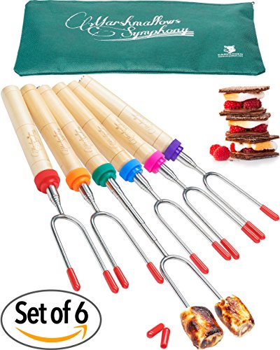 👪 QUALITY COOKWARE FOR YOUR FAMILY EVENTS: Super Fun to use and Easy to Clean, these Premium, stainless steel extending sticks will be a great addition to anyone’s camping cooking kit. Kids have such a blast using them! You will get six rotating forks, with natural wood handles, 6 different vibrant color rings, tip protectors for safety, PLUS FREE cute Zippered Storage Pouch & Roasting Guide E-Book with Amazing Cooking Recipes. Who knew you could get so excited about marshmellow sticks, right?