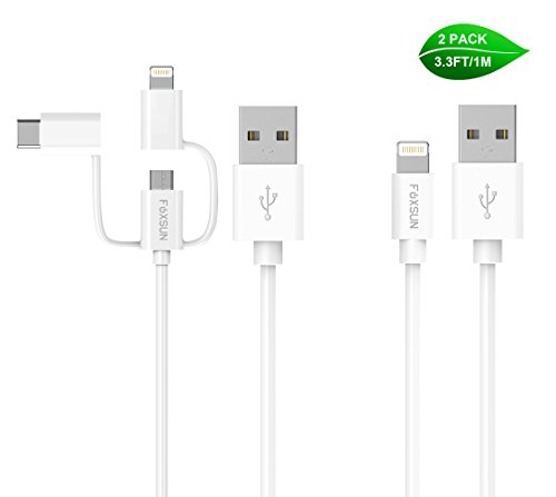 [2 Pack]Multi USB Charging Cable,Foxsun 3.3ft/1m 3-in-1 USB Charger Cable with Type C/8Pin Lighting/Micro USB Connector + Single Lightning Cable MFi Certified for iPhone,iPad and Android Devices–White