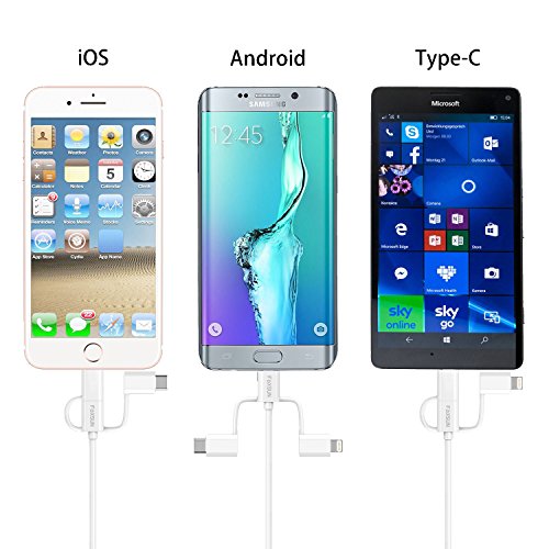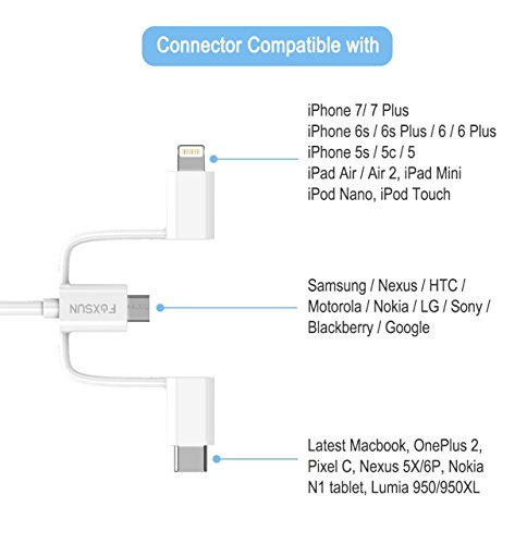[3-in-1 Design] -3 in 1 design (Micro USB Connector, 8 Pin Lightning Connector, and Type C)makes the cable widely compatibles with IOS iPhone iPad, Android smart phones and Type C cellphones devices meanwhile.no need to carry around different cables with all the times.