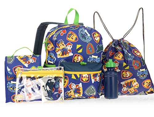-. Brand : Spinmaster -. Color : blue, red, multi -. Department : boys -. EAN : 0650045967556 -. Feature : Chase, Marshall and Rubble cartoon puppy graphics / Large 16" backpack for kids; front zipper pocket and mesh side pockets / Insulated lunch bag with velcro closure (9"H x 8"W) / Utility case for pens, pencils and school supplies; cinch sack for accessories / 18 oz. navy blue plastic water bottle with flip top lid (BPA free) -. Model : B17PP35216-XX0 -. PackageQuantity : 1 -. ProductGroup : Apparel -. ProductTypeName : LAGE -. Size : 16-inch -. Title : Nickelodeon Paw Patrol 5-Piece Backpack School Supplies Set -. UPC : 650045967556