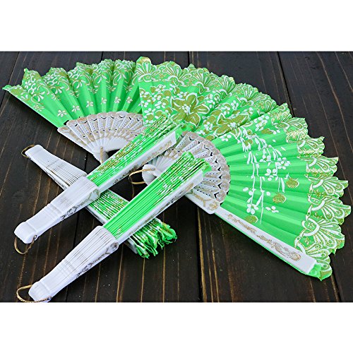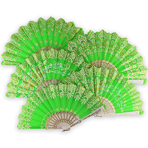 Just Artifacts 9” Glitter Flower Pattern Silk Hand Fans (Set of 5, Kiwi Green w/ Gold & White)