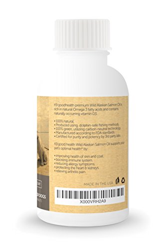 - Feature : BUY 2 GET 10% OFF PLUS FREE SHIPPING! / 2% PROFITS GO TO ASPCA We care about animals / ONE A DAY FOR SHINY HEALTHY COAT AND SKIN Our salmon oil for dogs supplies the essential Omega 3 fatty acids in a dose frequently recommended by vets and helps reduce inflammation and contribute to overall health and well-being / ECO & ANIMAL FRIENDLY FORMULA Unlike other fish oil for dogs, our supplement is environmentally friendly, as it's made from wild caught salmon sourced through dolphin-safe fishing methods and is made using 100% green carbon-neutral technology / PREMIUM QUALITY Our omega 3 for dogs is manufactured in accordance to FDA standards and certified for purity and potency by 3rd party labs so you can feel good giving it to your pets