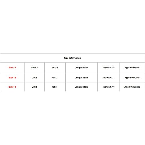 ?: Description: ?: ?: Sole material:Rubber sole ?: Material of shoes:Artificial leather ?: Soft material makes baby feel very comfortable ?: Prefect for Spring daily use and easy to take off or wear ?: Anti-slip design keeps baby in safe ?: Great gift to baby ?: Gender:Girls ?: Pattern Type:Sandals ?: Package content:1 pair shoes ?: ?: Note: ?: ?: Due to lighting effects, monitor's brightness/contrast settings etc,there could be some slight differences in the color tone of the pictures and the actual item ?: If you have problem of the item, please contact us we will do our best to resolve the problem for you ?: We suggest you choose a larger size, if your actual feet length is longer than the?above?feet length ?: ?: Size Details ?: ?: Size:11===UK:1.5==US:2.5==Length:11CM===Inches:4.3"===Age:3-6 Month ?: Size:12===UK:2===US:3===Length:12CM===Inches:4.7"===Age:6-9 Month ?: Size:13===UK:3===US:4===Length:13CM===Inches:5.1"===Age:9-12Month 0